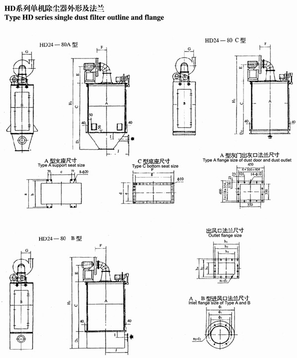 HD型袋式除塵器有六種規(guī)格:分A、B、C三型,A型設灰門、B型設抽屜,C型既不設灰門也不帶抽屜,下部加法蘭根據用戶要求直接配接在庫頂、料倉、皮帶運辦機等揚塵設備上就地除塵,粉塵直接回收。