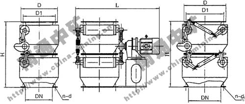 DN | D1 | D | H | H1 | L | n-d | 卸灰能力m3/h | 傳動(dòng)裝置型號(hào) | 開閉頻率次/min | 功率kw |