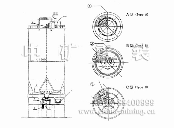 水泥儲存庫是在庫底中心位置設(shè)一錐形混合室,以降低庫內(nèi)的卸料壓力,消除漏斗流。混合室 設(shè)8~12個(gè)進(jìn)料孔,在混合室和庫壁之間的環(huán)形區(qū)設(shè)有8~12個(gè)充氣區(qū),卸料時(shí)輪流向相對的環(huán)形小 區(qū)充氣,使部分水泥流向中心混合室。在自上而下的流動過程中,切割水平料層而產(chǎn)生重力混合作 用,進(jìn)入混合室后又因混合室內(nèi)的連續(xù)充氣攪拌而進(jìn)一步均化。這種庫的均化值可達(dá)5~9。電耗 0.15~0. 30kwh / t.
