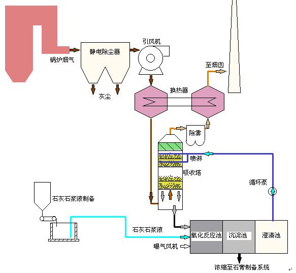 一、濕式石灰(石)/石膏法煙氣脫硫技術(shù),其工藝流程圖如上: 鍋爐煙氣在吸收塔內(nèi)與石灰(石)粉形成的漿液進行逆流接觸反應(yīng)。吸收塔下段低PH值有利于氧氣和石灰石溶解,上段較高PH值有利于吸收反應(yīng),提高脫硫效率。