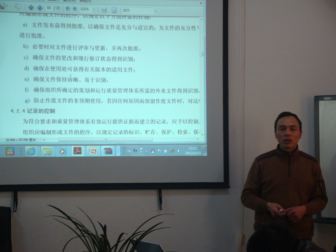 3.23日,公司聘請ISO9000管理體質(zhì)培訓(xùn)講師王兵老師對全體職員進行培訓(xùn)學(xué)習(xí)。王老師以其豐富的現(xiàn)場管理經(jīng)驗,領(lǐng)導(dǎo)完成多項生產(chǎn)、質(zhì)量技術(shù)改造工程;策劃和推行以過程為導(dǎo)向的質(zhì)量有效控制與現(xiàn)場持續(xù)改善活動,解決公司產(chǎn)品的關(guān)鍵質(zhì)量問題,大大提高了產(chǎn)品的合格率。王老師在生產(chǎn)管理、質(zhì)量管理培訓(xùn)領(lǐng)域有豐富的授課經(jīng)驗,講授公開課暨企業(yè)內(nèi)訓(xùn)三百多次。講課主要特點是能針對不同的企業(yè)特點、學(xué)員層次、結(jié)合企業(yè)的實際情況采用不同的授課方式和內(nèi)容。