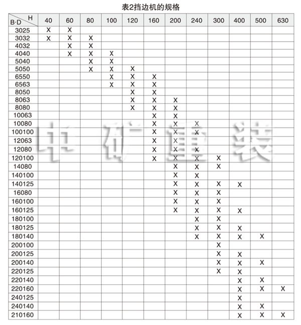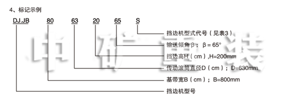 3、規(guī)格:按基帶寬B(cm)、檔邊高H(mm)和傳動滾筒直徑D(cm)可以組合成101中規(guī)格(見表2)。