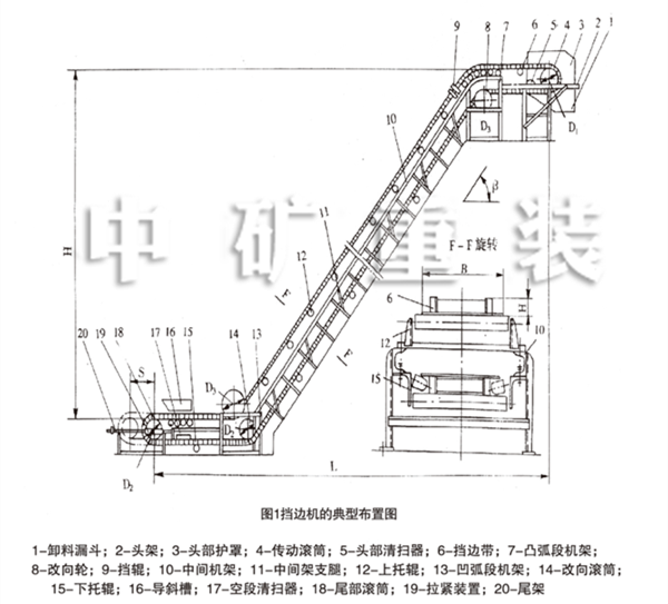 為了獲得較好的受料和卸料條件,在輸送傾角大于45°時,波狀檔邊帶式輸送機推薦采用“S”型和“SC”型布置型式,即檔邊機設有下水平受料段和上水平卸料段(見圖1)。