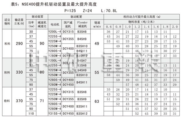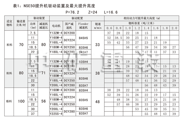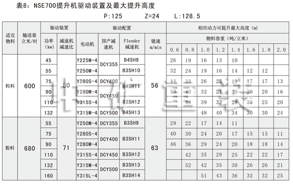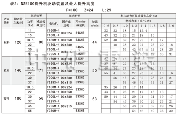 NSE系列高速板鏈斗式提升機(jī)共有九種基本型號(hào):NSE100、NSE200、NSE300、NSE400、NSE500、NSE600、NSE700、NSE800、NSE1000,每種型號(hào)根據(jù)輸送物料的不同,選擇不同的提升速度,提升速度≤70m/min,提升高度65m。另外,中礦公司還可根據(jù)用戶要求輸送量介于上述型號(hào)之間的擴(kuò)展型號(hào)。