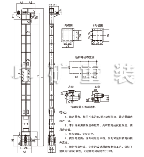 TD型斗式提升機(jī)適用于垂直輸送粉狀、粒狀,及小塊狀的磨琢性較小的散狀材料,如糧食、煤。水泥、碎礦石等,提升高度40m,其特點為結(jié)構(gòu)簡單,運行平穩(wěn),挖取式裝料,離心式卸料,物料溫度普通膠帶不超過60℃,夾鋼絲膠帶可達(dá)80℃,耐熱膠帶可達(dá)120℃,與傳統(tǒng)D型斗提升機(jī)相比,輸送效率高,料斗型式多,應(yīng)優(yōu)先選用。