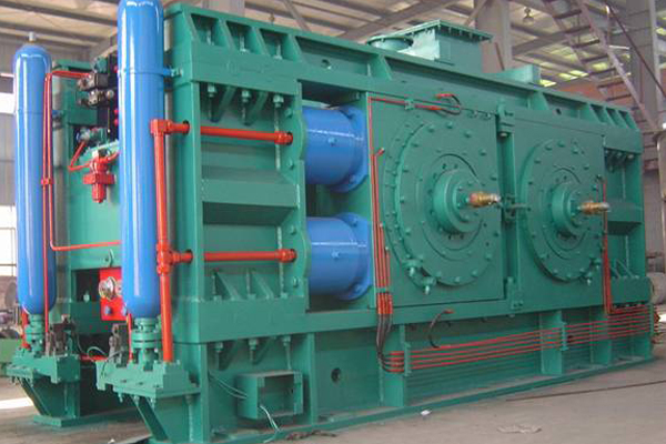 輥壓機(jī)主要由軸線平行一對(duì)實(shí)心碾輥組成,輥面采用堆焊輥面,輥?zhàn)油ㄟ^輥軸兩端的軸承座安設(shè)在框架內(nèi),一個(gè)輥?zhàn)酉鄬?duì)框架是固定的,稱為定輥,另一輥?zhàn)拥妮S承座可以在框架內(nèi)沿滑道作水平往復(fù)運(yùn)動(dòng),稱為動(dòng)輥,工作時(shí)兩輥向中間作相向轉(zhuǎn)動(dòng),液壓系統(tǒng)施加的壓力通過動(dòng)輥軸承座傳遞到物料推向定輥,機(jī)械限位保持兩輥間存在一定間隙,此時(shí)壓力通過機(jī)械限位傳遞給框架,當(dāng)有物料喂入兩輥之間時(shí),物料被咬入,兩輥被撐開,此時(shí)液壓系統(tǒng)施加的壓力通過動(dòng)輥傳給物料,再經(jīng)定輥、定輥軸承座、定位銷、傳給框架,在此過程中,兩輥間通過物料產(chǎn)生作用力及反作用力,使物料得到粉碎。
